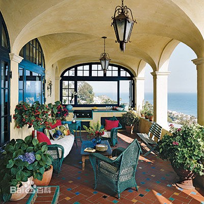 地中海周邊國家的建筑及室內(nèi)風(fēng)格,特點是顏色淳樸和紅瓦白墻。通過眾多的回廊、穿堂、過道,增加海景欣賞點的長度,同時利用風(fēng)道的原理增加對流,形成穿堂風(fēng)這樣的所謂被動式的降溫效果。地中海風(fēng)格多采用馬賽克、小石子、瓷磚、貝類、玻璃片、玻璃珠等做點綴裝飾,窗簾、桌巾、沙發(fā)套、燈罩等均以低彩度色調(diào)和棉織品為主。多用小細(xì)花條紋格子圖案。
